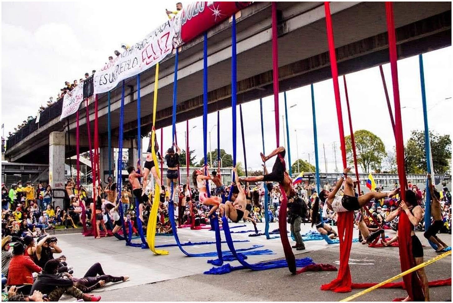 Sorzano suggests that the mass protests and collective action in Colombia depended on artistic spaces in which multiple forms of solidarity could be expressed. Circus performance, for instance, becomes pedagogical and political insofar as their aim is to teach us how to enact and embody solidarity while engaged in collective action. Circus performances, like many other artistic demonstrations, were accompanied by ollas comunitarias that provided food and resources for artists. In the context of the strike and the pandemic, community pots acquired a significant role in providing food to millions of under-nourished people. Dorado (2020) describes the practice as “a symbol of unity, collective and collaborative work, a sign of solidarity and reciprocity, a sign of mutual help and care….These notions and practices are linked to the philosophies of Buen Vivir and Ubuntu, which are also grounded on principles of solidarity, reciprocity, and sharing. Buen Vivir is the umbrella term that encompasses Amerindian philosophies focused on the good life in a broad sense (Gudynas, 2011). It embraces a notion of well-being that is only possible within a community, connoting the fullness of life in communal living. Once again, cultural and artistic expressions from below are linked to the political.